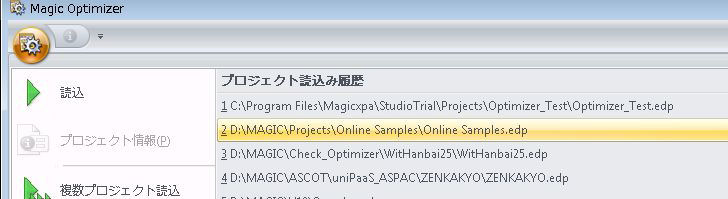 プロジェクトの読込み履歴過去に読み込まれたプロジェクトの履歴が、右側に9件まで表示されます。これをクリックすることで読み込むこともできます。